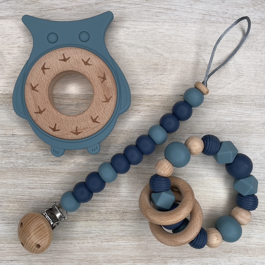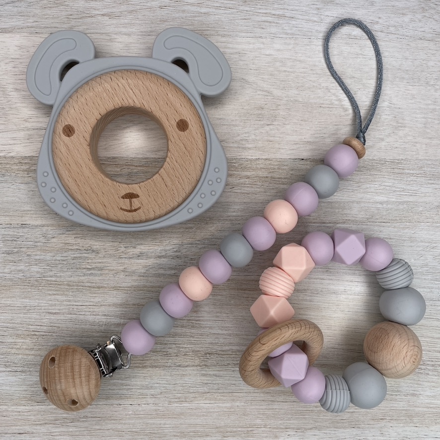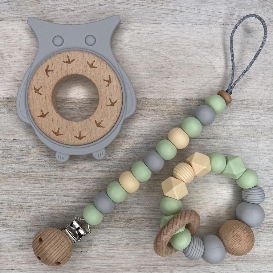 Onze cadeausetjes zijn te verkrijgen in verschillende leuke kleurtjes. Het bijtfiguurtje mag je zelf kiezen, want er zijn telkens enkele opties mogelijk. En zoals altijd: vind je niet helemaal je ding, dan contacteer je ons gewoon. Wij maken altijd met plezier iets wat jij wel helemaal perfect vindt! Klik hieronder op de foto om naar de gewenste set te gaan voor meer info!