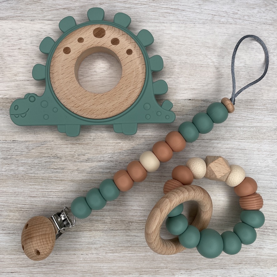 Bij ons kan je terecht voor babysetjes in verschillende kleurtjes. Een setje bestaat uit een speenkoordje, een bijtspeeltje en een bijtfiguurtje.