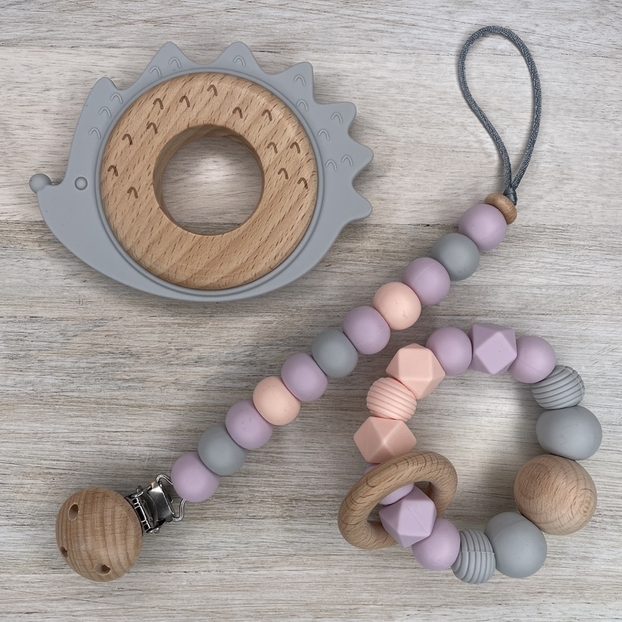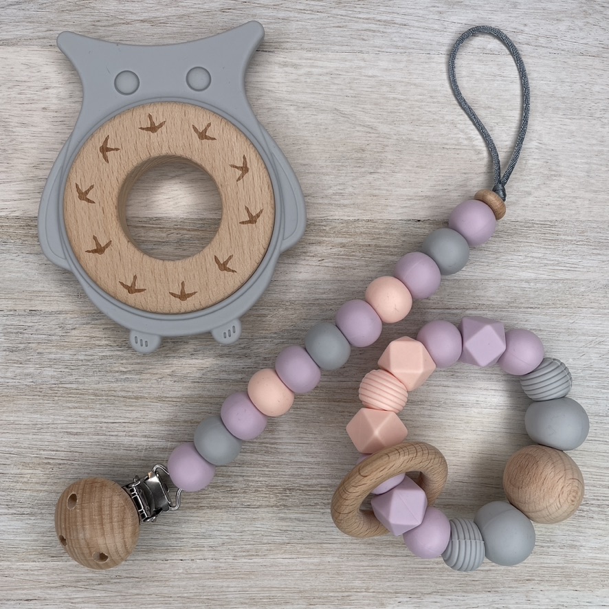 Bij ons kan je terecht voor babysetjes in verschillende kleurtjes. Een setje bestaat uit een speenkoordje, een bijtspeeltje en een bijtfiguurtje.