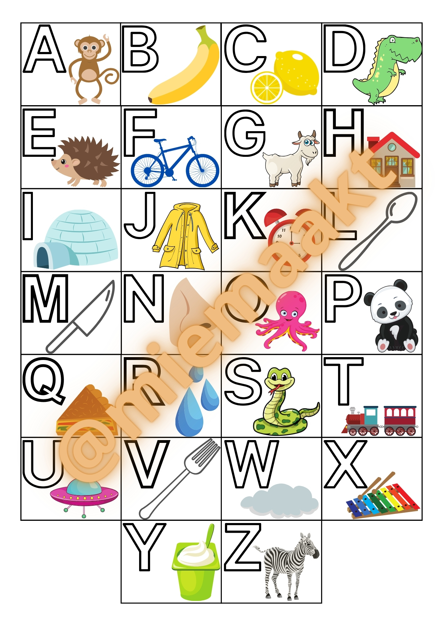 Deze letterposter maakte ik voor Leon op het moment dat hij heel veel interesse toonde in de lettertjes. Soms was het wat zoeken naar woorden die met een bepaalde letter beginnen, maar dankzij deze poster was het gedaan met zoeken! Leon kon naar het prentje kijken en hij wist meteen een woordje. Spontaan begon hij dan zelf te zoeken naar andere woordjes.