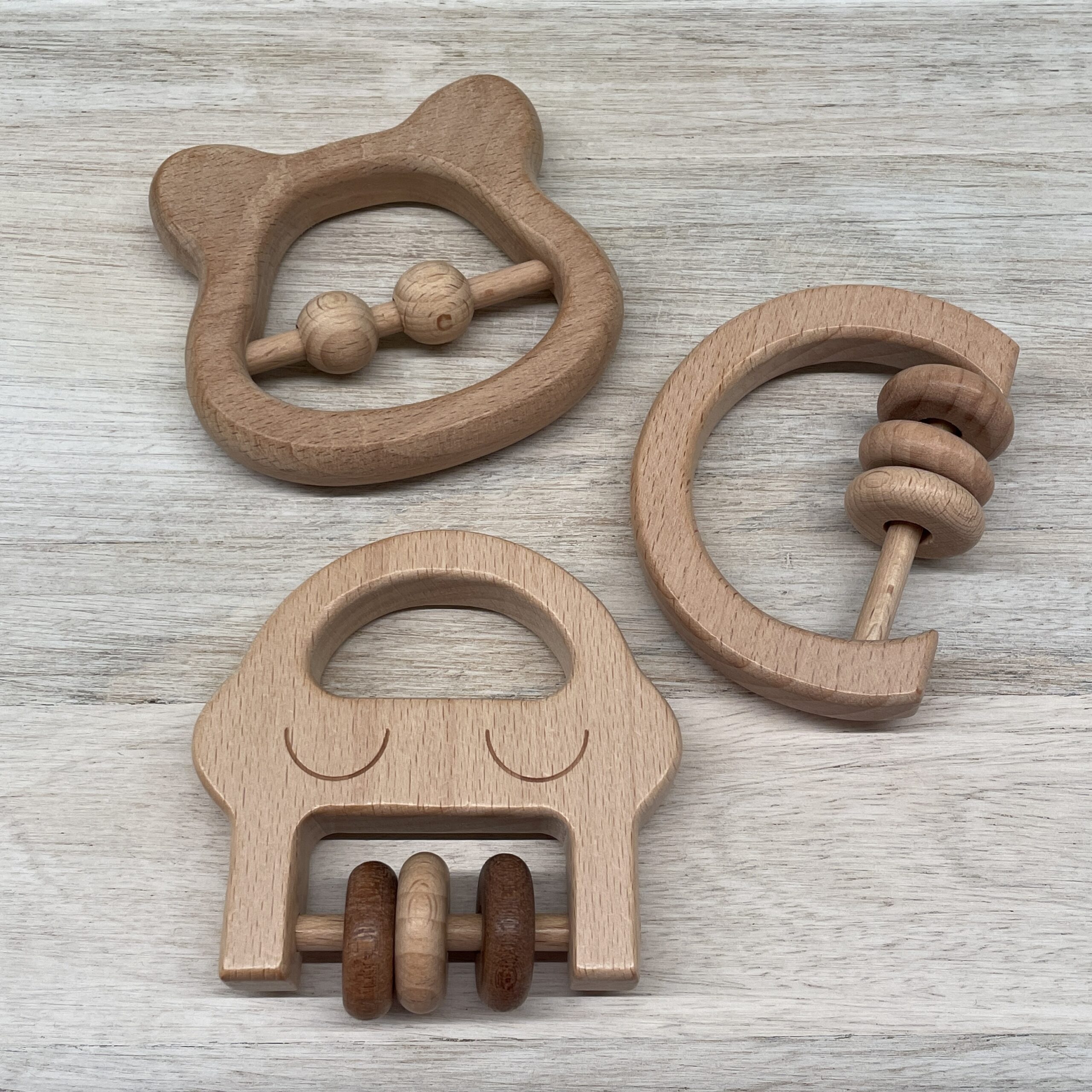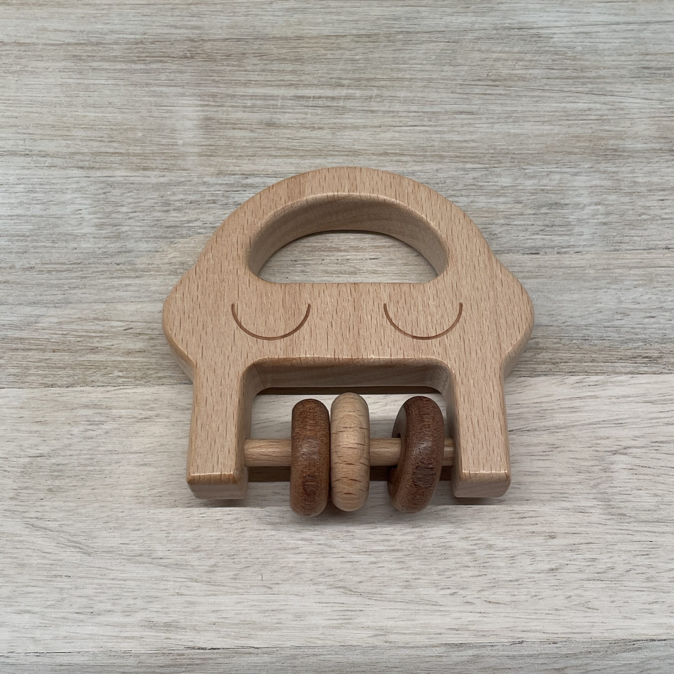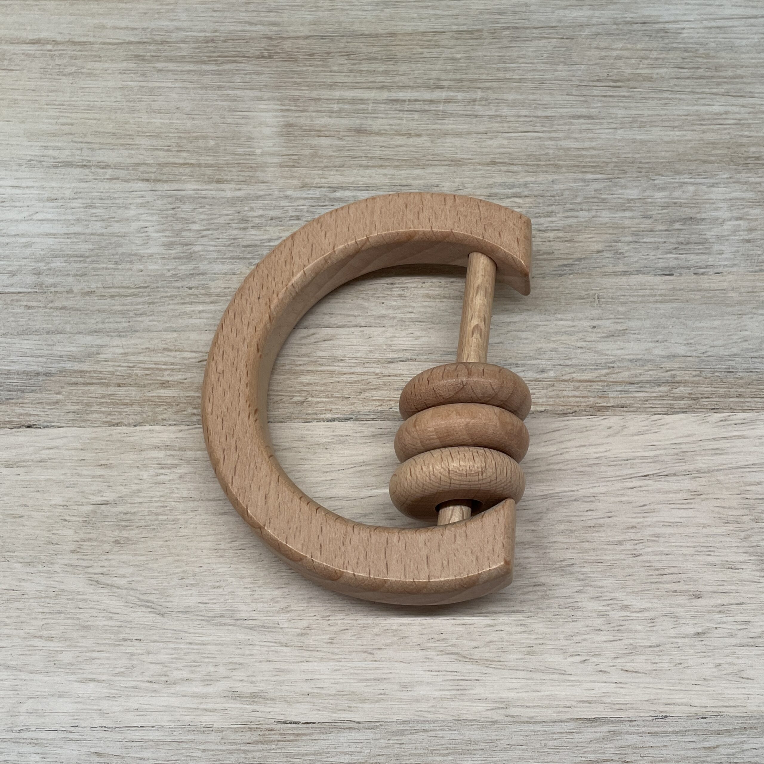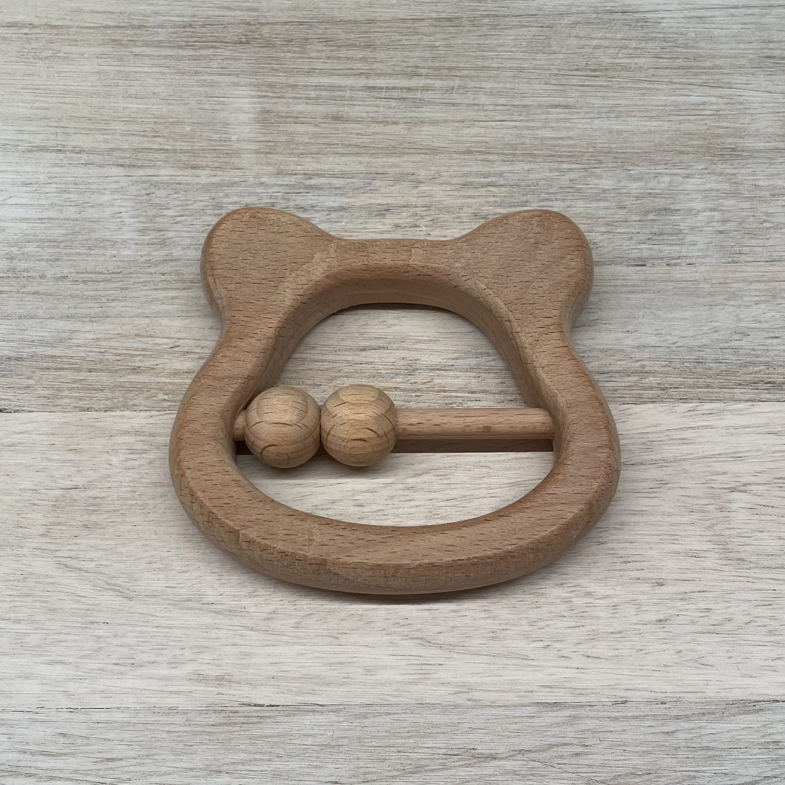 Deze houten rammelaar kan ook gebruikt worden als bijtspeeltje.