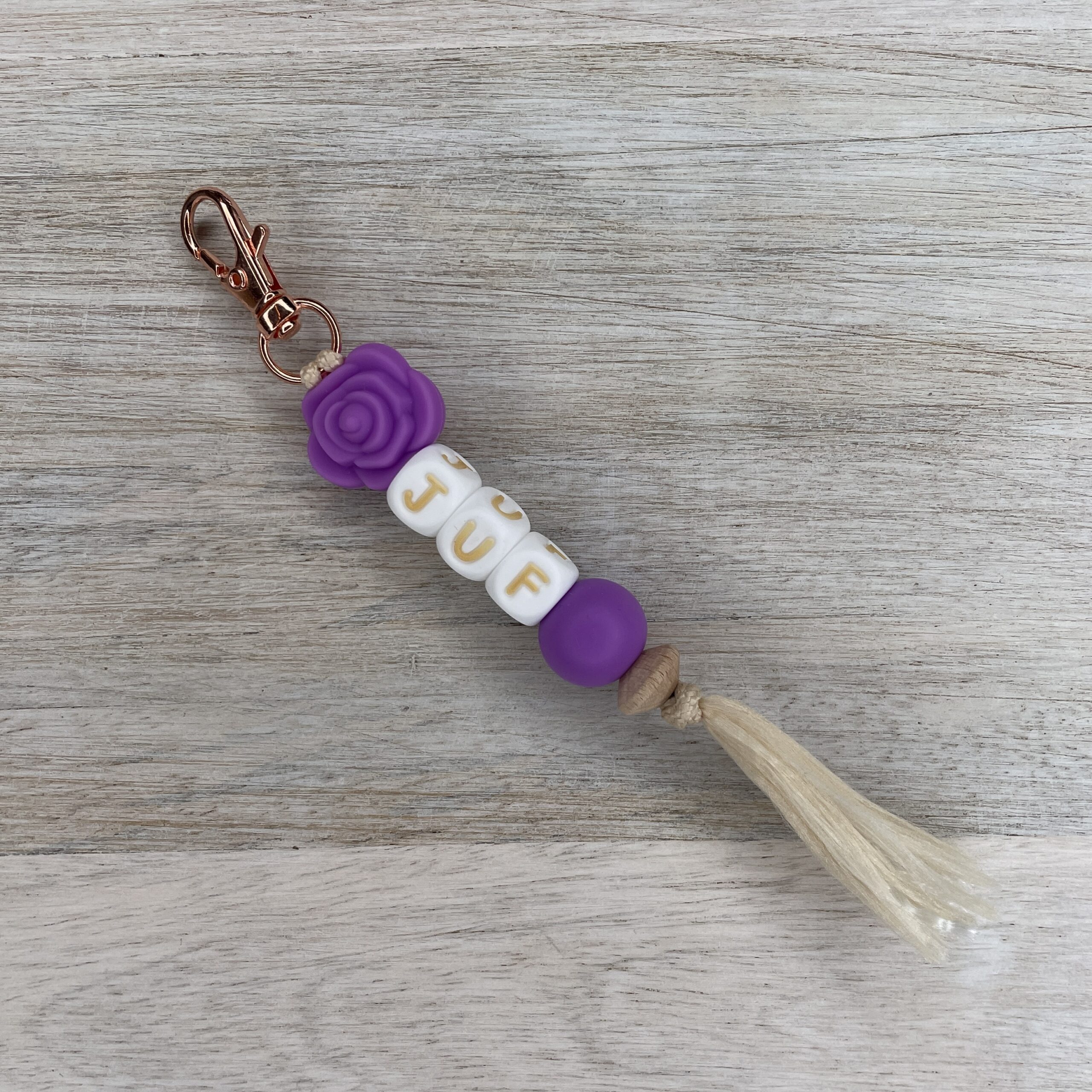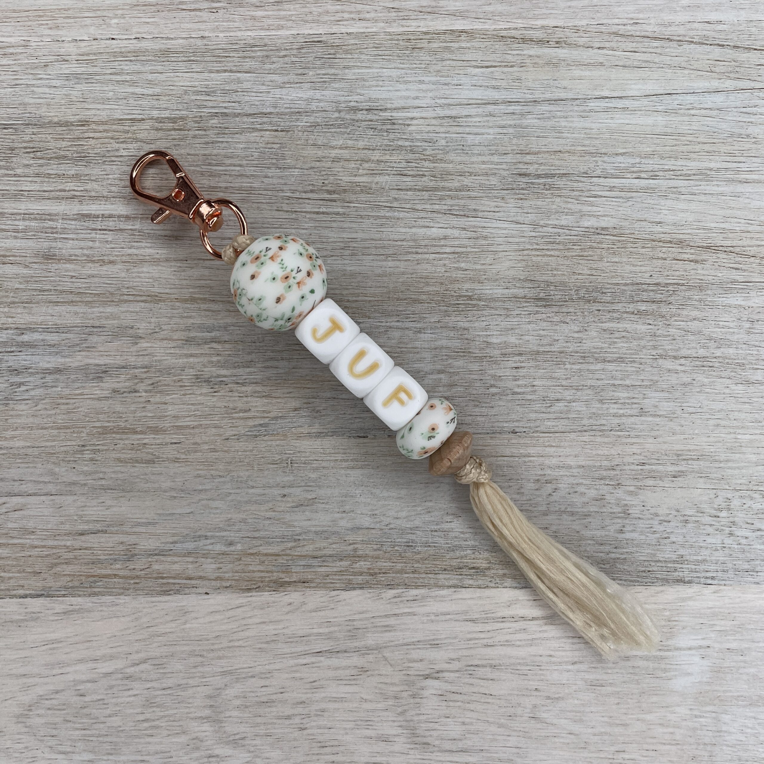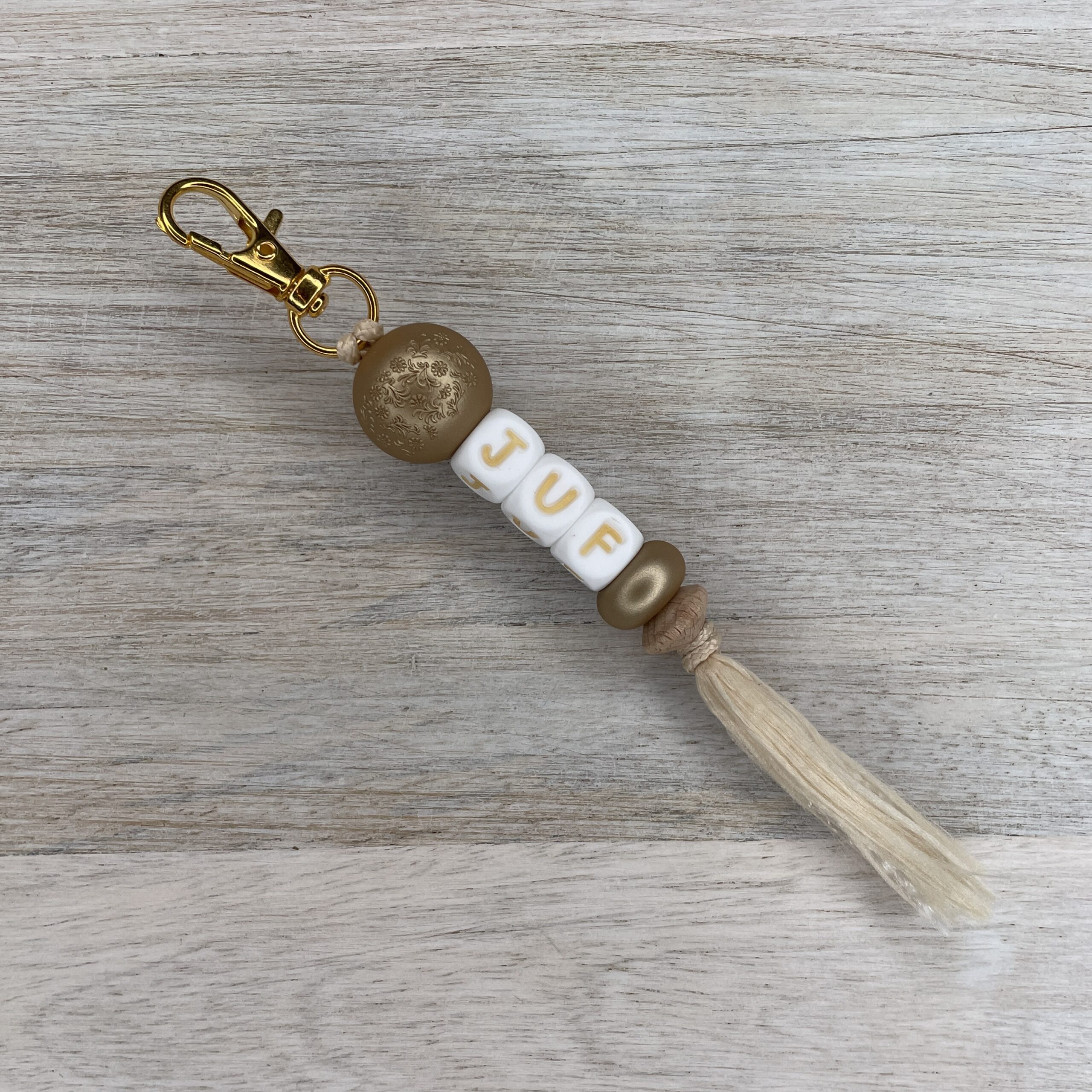 Sleutelhangertje “juf” wit-goud