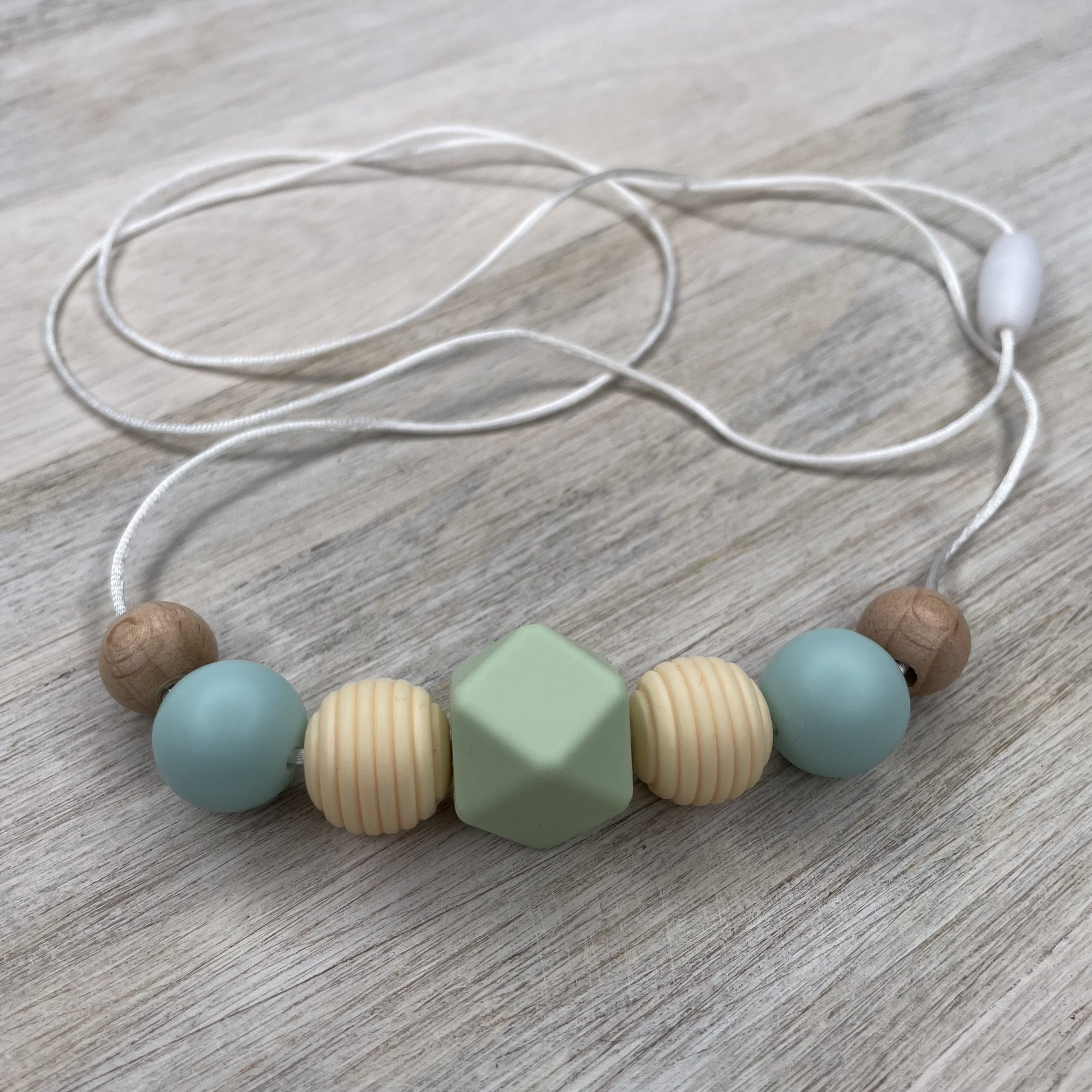• Een voedingsketting kan lang meegaan als je de ketting correct gebruikt en onderhoudt. De siliconen onderdelen kunnen eenvoudig schoongemaakt worden met behulp van een klein beetje water. De houten onderdelen kan je voorzichtig insmeren met een druppeltje natuurlijke olie (bv. kokosolie).