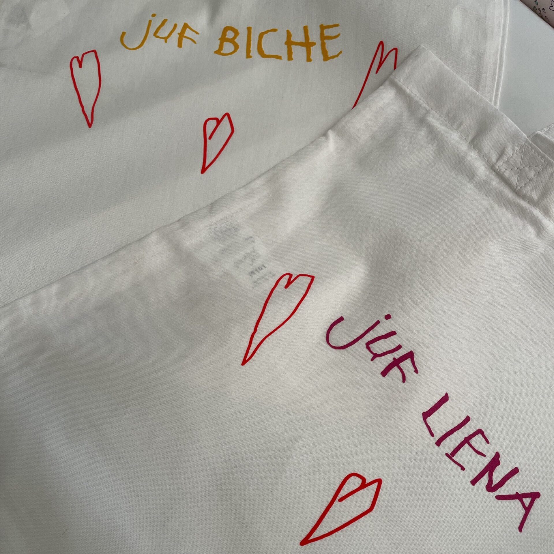 Ik maakte dan ook speciaal voor die twee toppertjes een super origineel cadeau: een bedrukte tote bag. Ik bedrukte deze niet gewoon met hun naam in één of ander mooi lettertype, maar wel met het ‘handschrift’ van Leon. Het resultaat is echt super origineel en heel mooi.